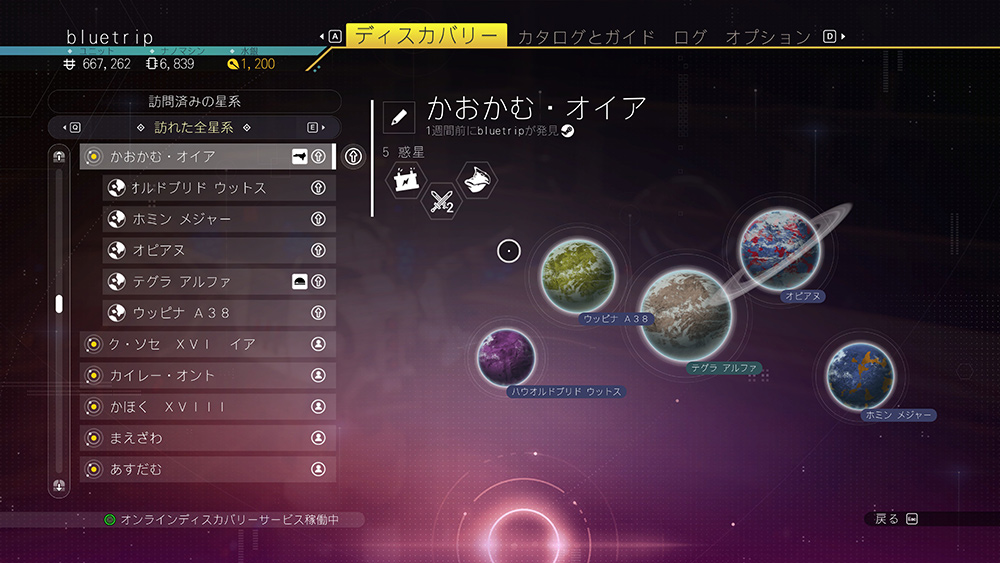 発見した惑星や星系の情報はクラウドで共有され、他のプレイヤーが同じ惑星に降り立つことも可能です。