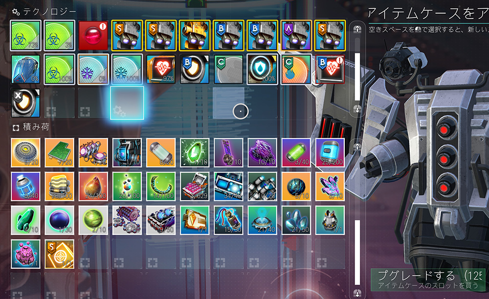「テクノロジー」の方にカーソルを合わせると、インベントリではなくテクノロジー枠が拡張できます。