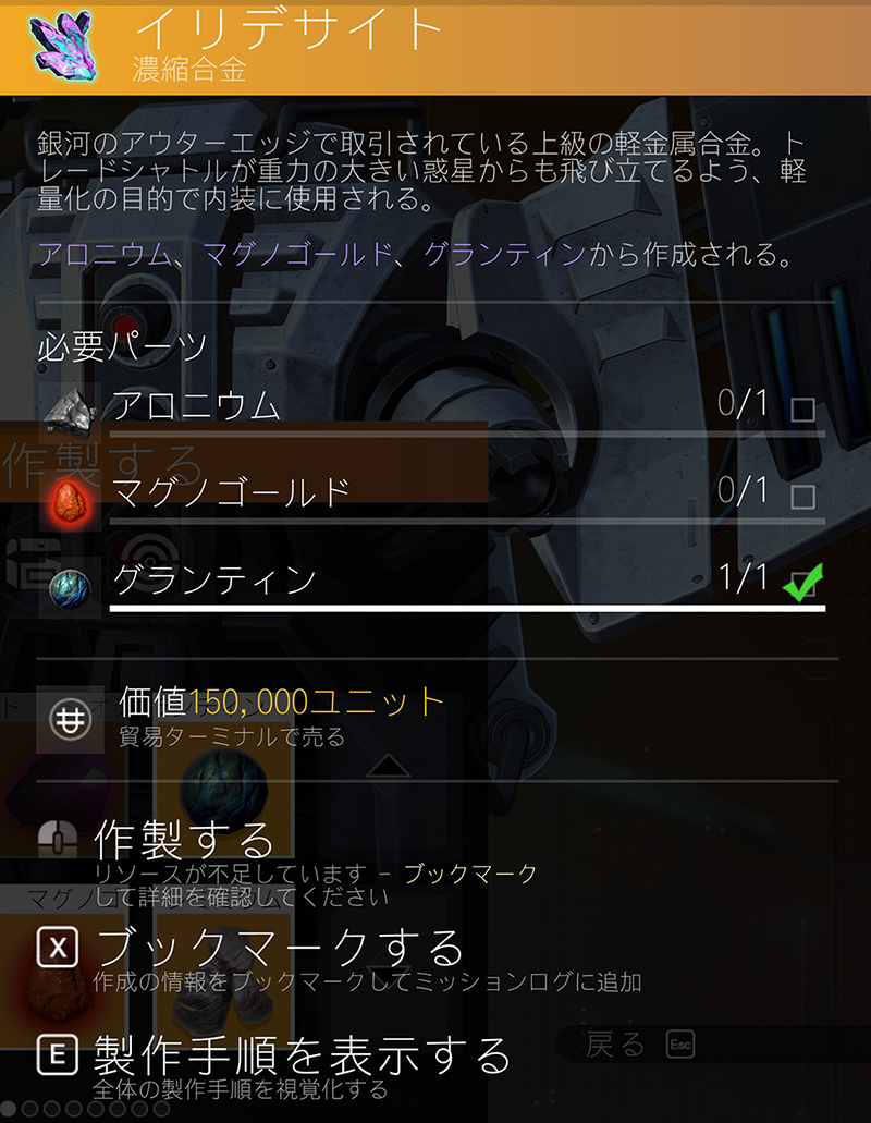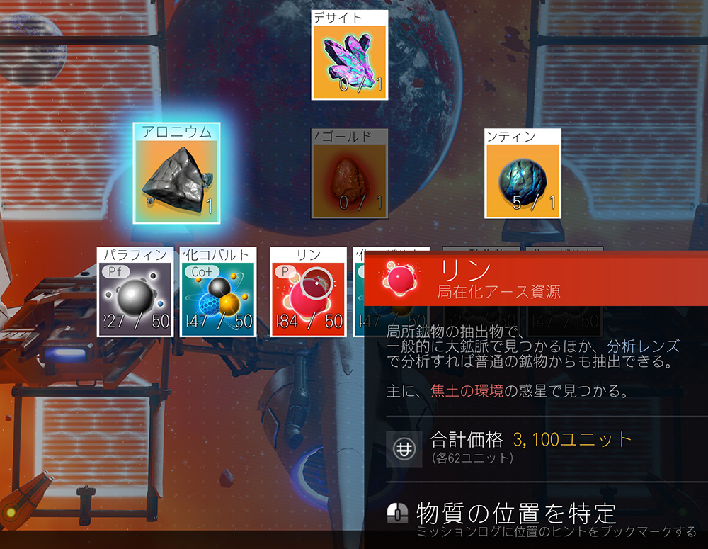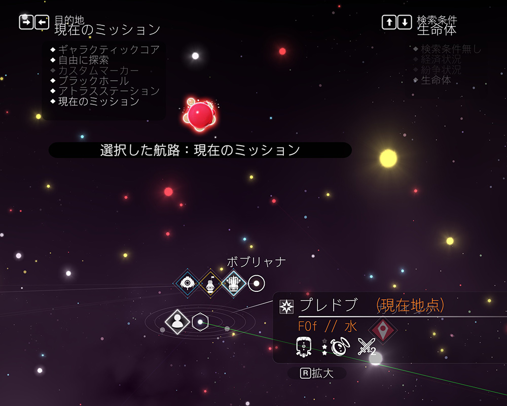 サブミッションとして登録してくれるので、宇宙空間上の「目的地」を「現在のミッション」に変更した際に、素材が存在する星系だけピックアップしてくれます。