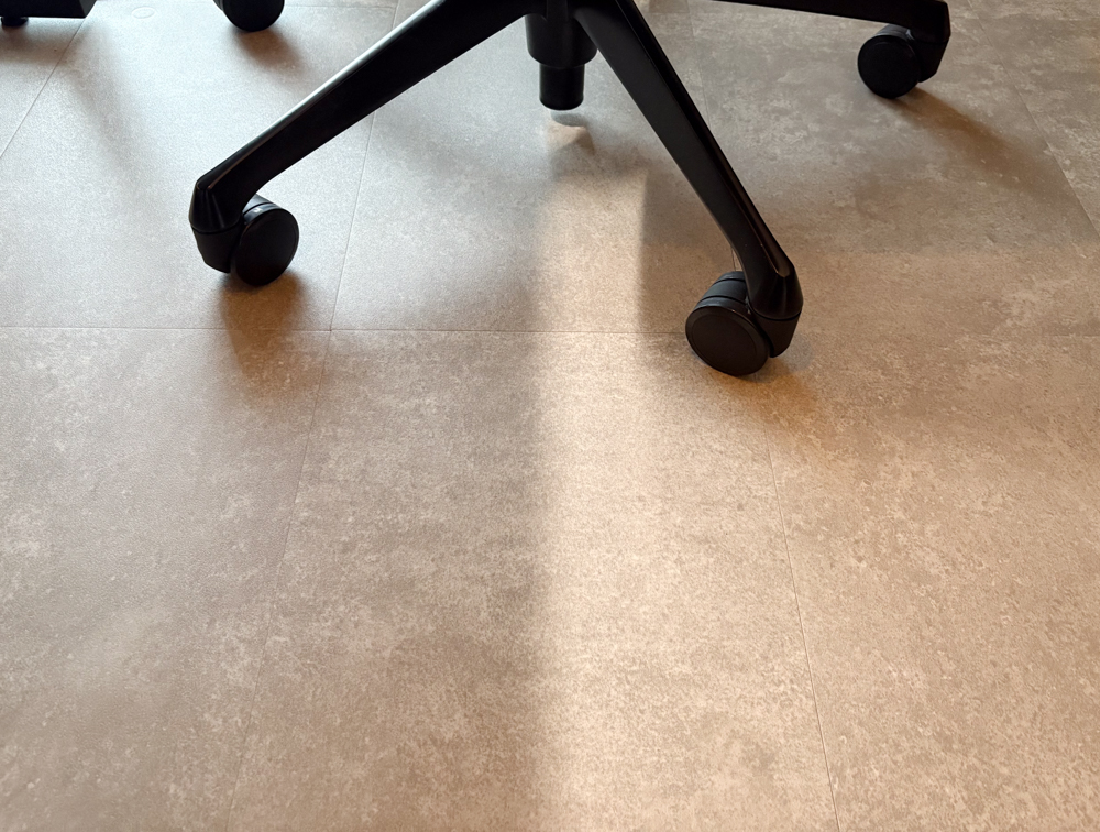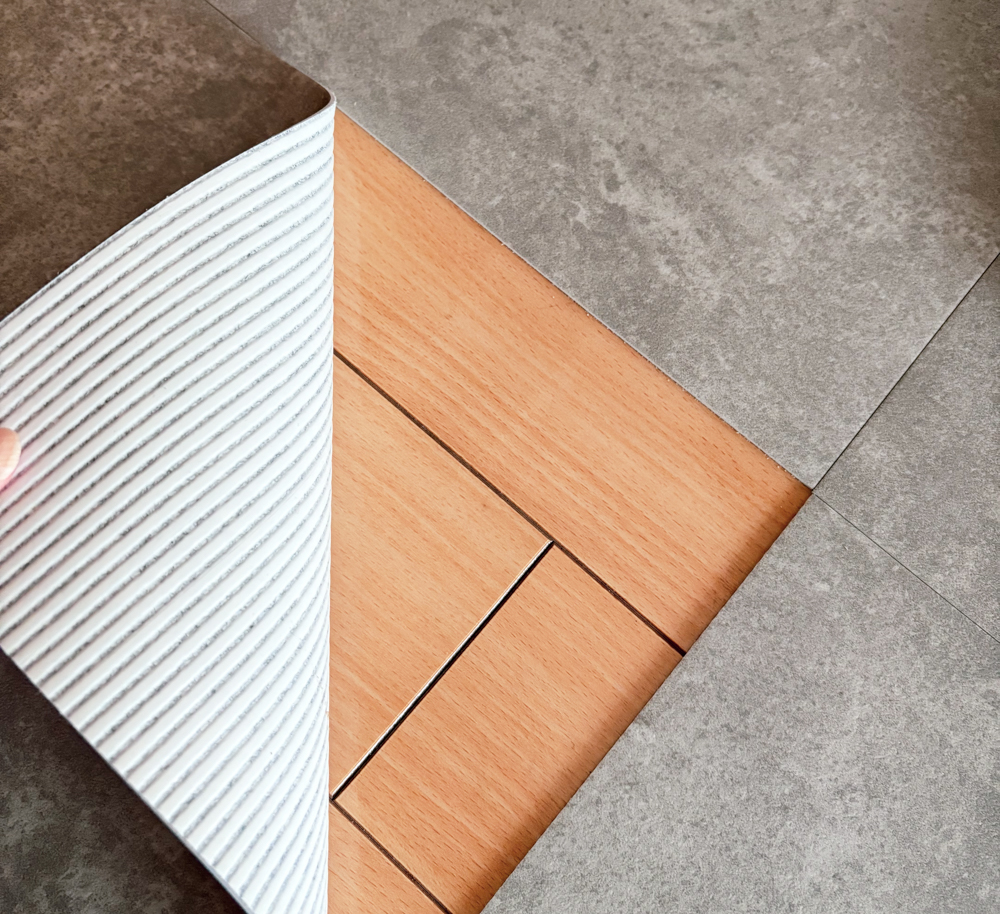 タイルは接着剤などを使用せず吸着しているだけなので、このように簡単に剥がすことができ、床も傷つけない上に保護もできるため退去時も安心です。