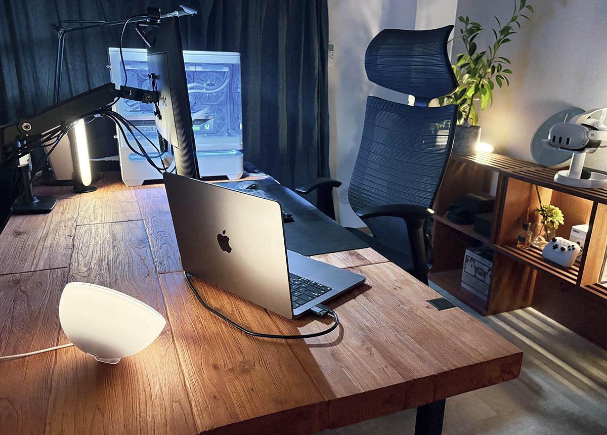 壁に向かってデスクを配置するレイアウトが一般的だとは思いますが、部屋の中央に置くことで、椅子とモニタの位置を変更して気分転換ができたりと、自分の中では今のところ一番しっくりきています。
