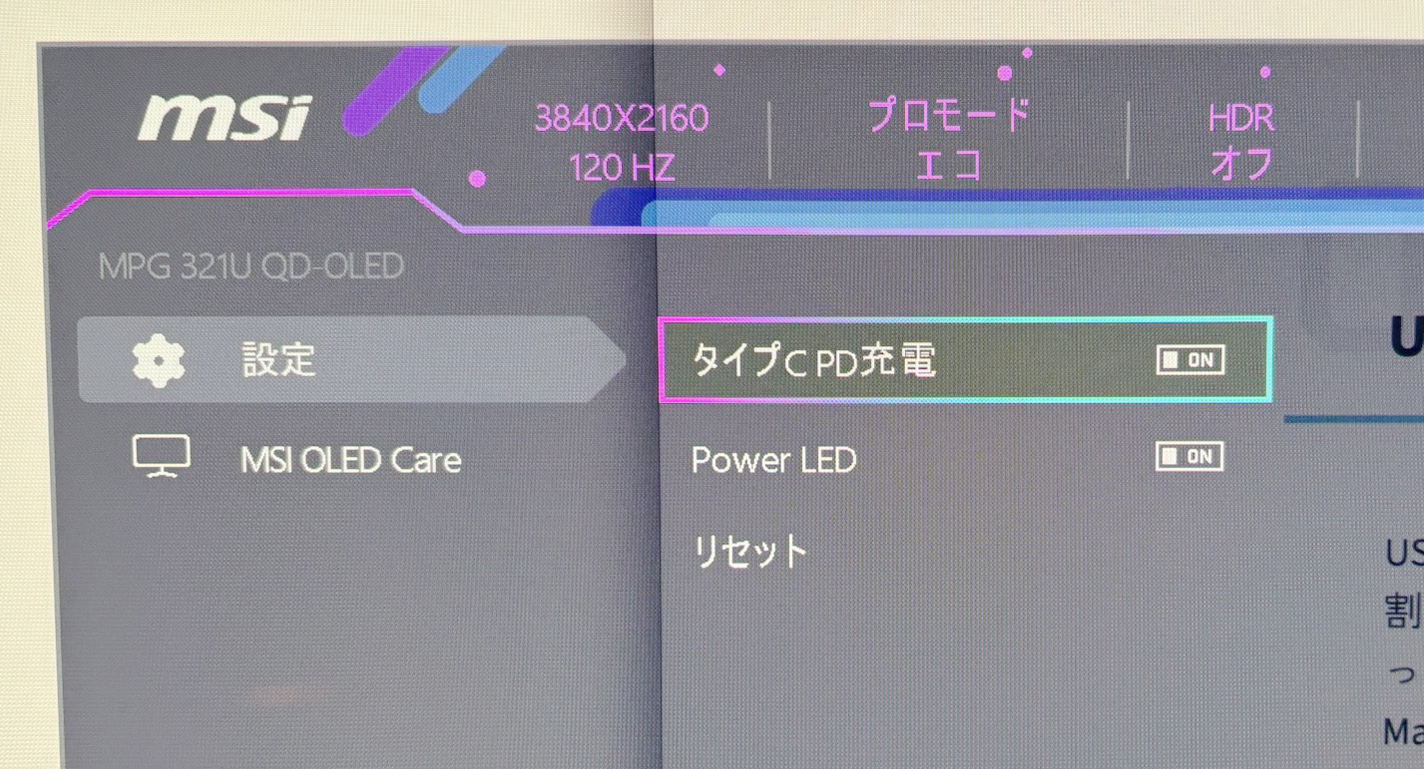 設定画面から「タイプC PD充電」をオンにしないと電源供給されません。(デフォルトではオフ)