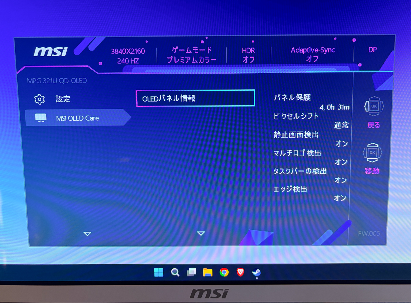 31.5インチ / 4K240Hz / 第3世代QD-OLED / グレアパネル / USB Type-C PDとハイエンドゲーミングモニターとして一通り欲しい機能が備わっています。