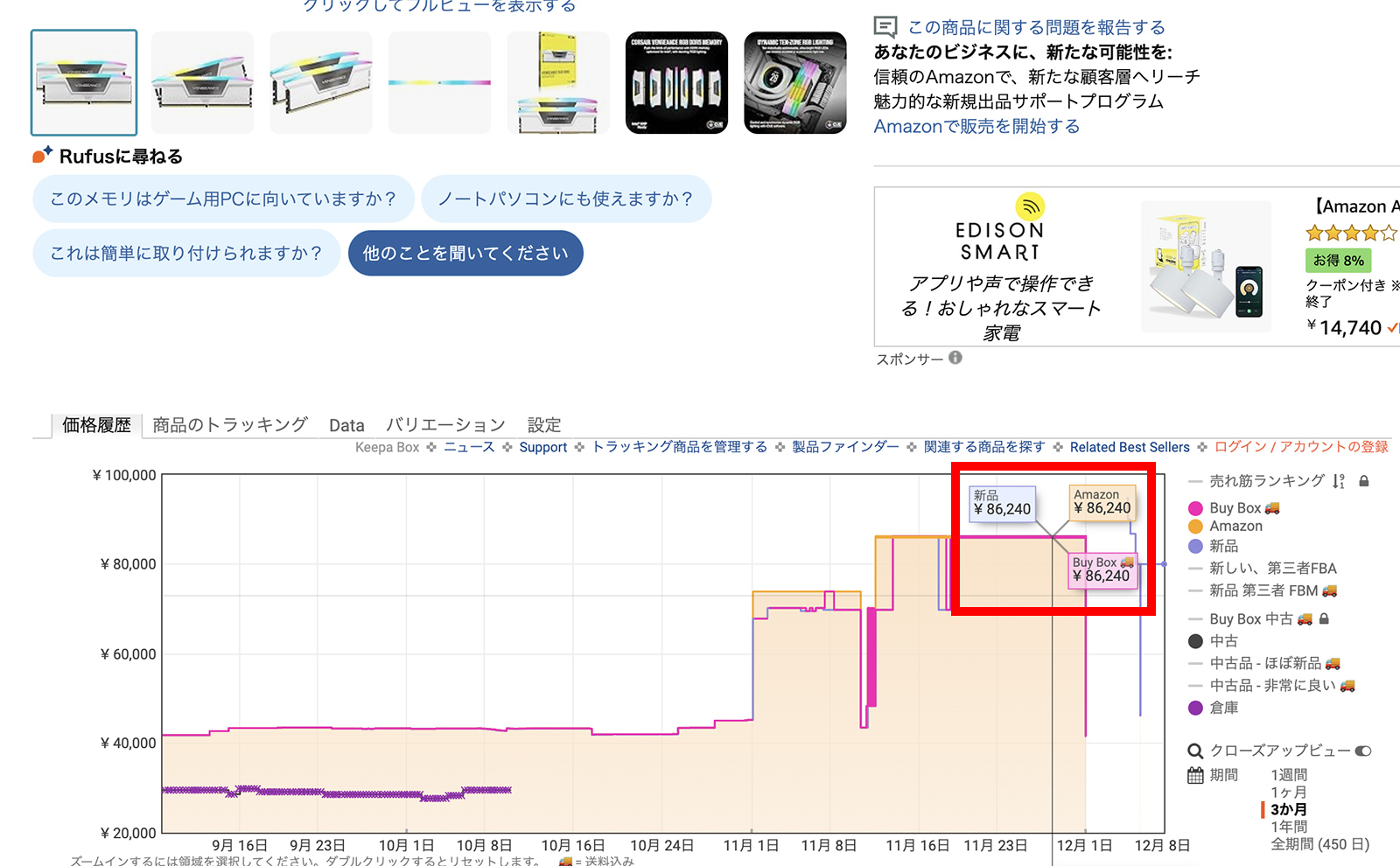 8月ぐらいには35,000円で購入できていた64GBメモリが、86,000円と2倍以上の価格に。